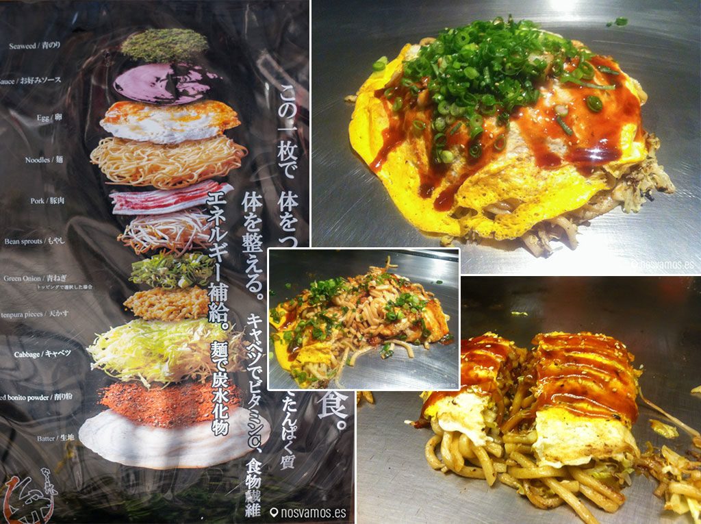 El Okonomiyaki es un conjunto de capas con diferentes ingredientes cocinados en una plancha (yaki, 焼き cocinado a la plancha). Por lo general te lo cocinan delante de ti, es todo un espectáculo, hacen que parezca fácil, pero no lo es, requiere mucha práctica para que el resultado sea algo parecido a una tortilla y no a un revuelto.