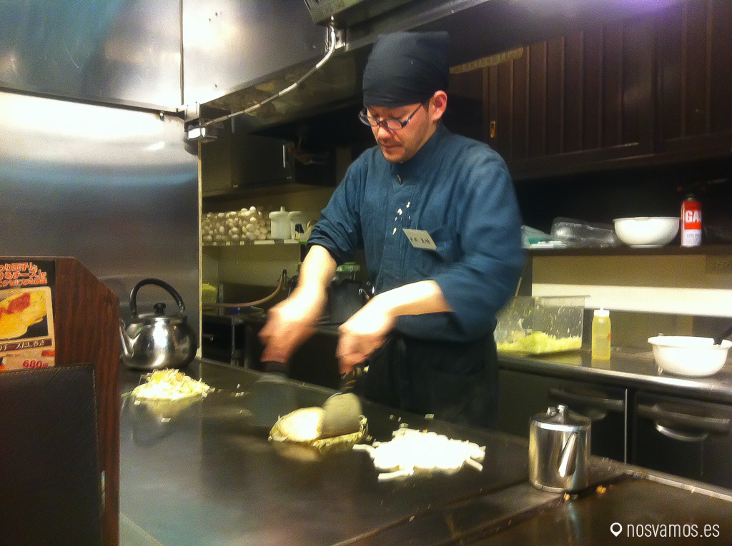El Okonomiyaki es una especialidad Japonesa, deliciosa y complicada de hacer aunque cuando ves a los cocineros elaborando 10 a la vez todo parece como si estuvieran haciendo tortillas españolas en una plancha.