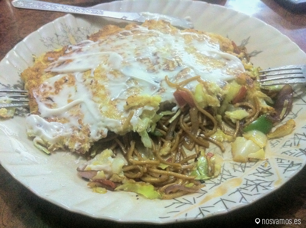 La primera vez que probamos este fantástico plato fue en Varanasi, India. Estábamos tomando algo en un chiringuito especialmente cutre de las callejuelas de la ciudad, llovía mucho así que estábamos haciendo tiempo y de repente empezó a oler bien, y cuando digo bien, digo MUY BIEN. Un chico que estaba en la mesa de al lado había pedido algo parecido a una tortilla española (el aspecto era idéntico) pero con mahonesa por encima, pero el olor era diferente. Miramos la carta pero no identificamos ningún plato con lo que veíamos así que no quedó otra opción, preguntamos cómo se llamaba ese plato, «japanish okonomiyaki«. Santísimo descubrimiento, lo probamos y estaba riquísimo. Poco después nos enteramos que era una especialidad Japonesa y especialmente de Hiroshima.